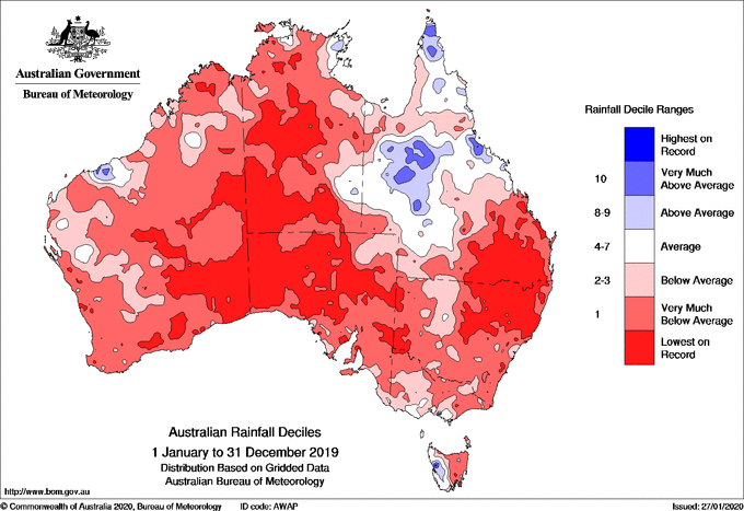 Unless otherwise noted, all maps and graphs in this page are licensed under the Creative Commons Attribution Australia Licence同時也是澳洲史上最乾燥的一年,平均降雨量僅有277.6毫米,比平均降雨量少了40%,全國僅有少數地區降雨量維持在平均值之上,大多數的區域降雨都明顯減少。