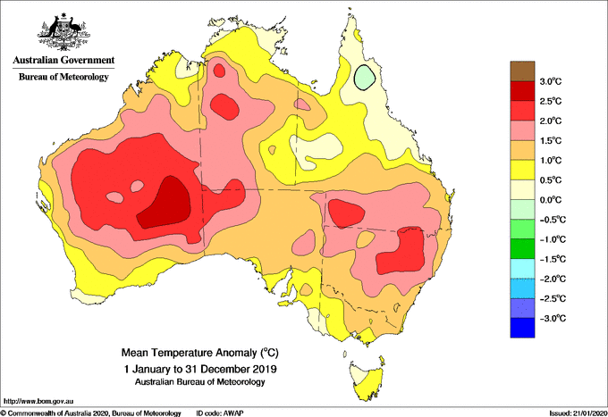 跟根據澳洲氣象局公佈的資料,2019年是澳洲史上最熱的一年,年平均氣溫比平均高出了1.52度C,全國平均最高與最低溫度都是有紀錄以來最高的。從澳洲氣象局提供的溫度距平圖就可以看到,澳洲大部分區域的氣溫都是高於平均值的。