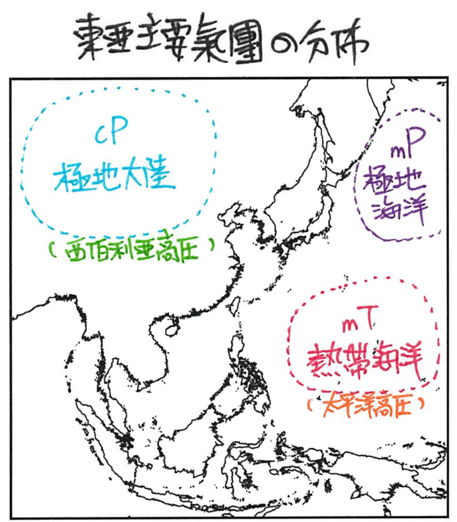 - 要改變空氣性質需要一段時間,因此空氣必須長時間待在特定區域,而高壓中心風速微弱且穩定,不易產生對流,有利於空氣長時間滯留原處,逐漸被當地特性影響。