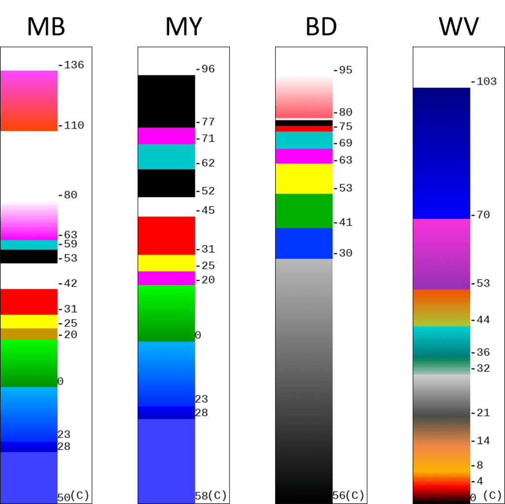- MY:針對梅雨鋒面結構而設計,與MB色調強化不同,此色調強化擁有更多種類的顏色區間,有利於分析大範圍的層狀結構。雖然色階對應表最低僅有攝氏負96度,但已足以應付梅雨之類的鋒面系統。