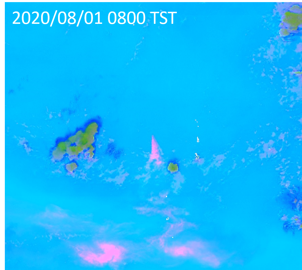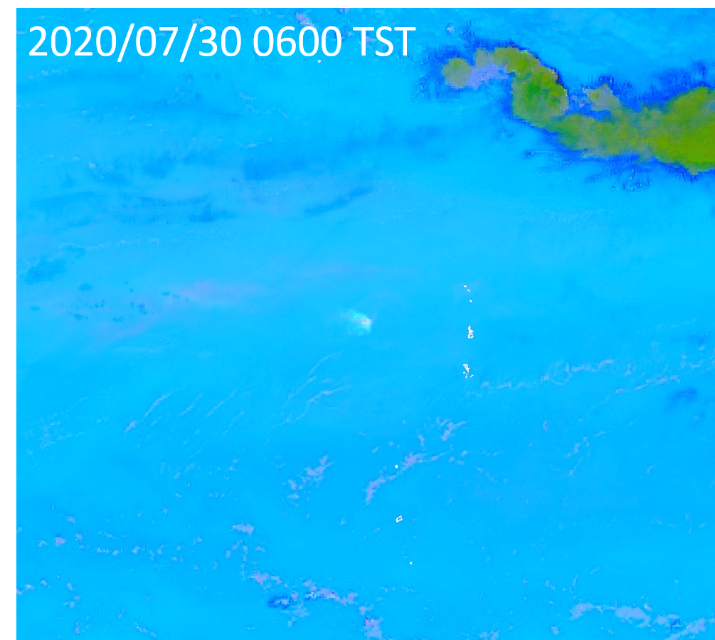 從Ash RGB合成圖中,我們希望偵測的目標有兩種:「火山灰」以及「火山氣體」,其中火山氣體在Ash RGB合成圖呈現出顯著的青綠色。圖中可以看到西之島在7月30日清晨6點左右,附近的區域呈現青綠色,表示周圍的大氣已經充斥著一定濃度的二氧化硫,足以被氣象衛星偵測出來。