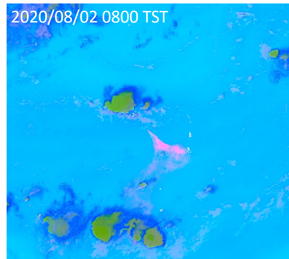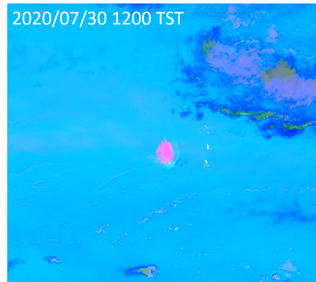 西之島火山在2020年6月份開始頻繁的噴發,本篇文章紀錄7月底至8月初完整的噴發過程,使用的資料為日本向日葵8號衛星。首先是台灣時間7月30日凌晨4時,西之島火山口開始釋放出富含二氧化硫的火山氣體,是準備噴發的前兆。