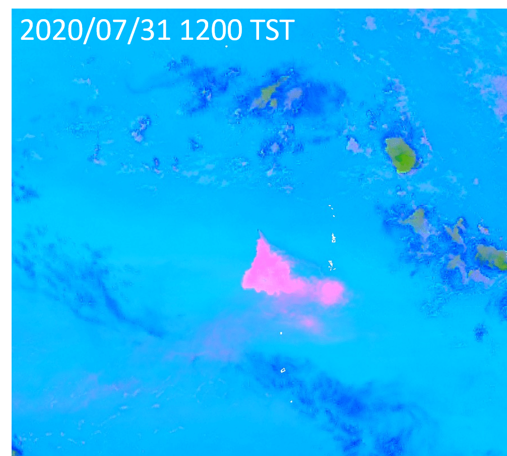 雲圖的時間是7月31日台灣時間中午12點整,西之島持續性地釋放大量火山灰,噴發出來的物質受到北風的吹拂,使得煙塵往南方擴散,此時的北風風速並不大,因此粉紅色區塊呈現著比較鈍的錐形,並得以累積在南方的大氣之中。除了顯著的粉紅色區塊之外,我們在更南方的位置可以發現比較不明顯的粉紅區塊,這是爆發前期所殘留下來的火山灰,但是因為受到氣流攪動的關係,濃度變的比較低。