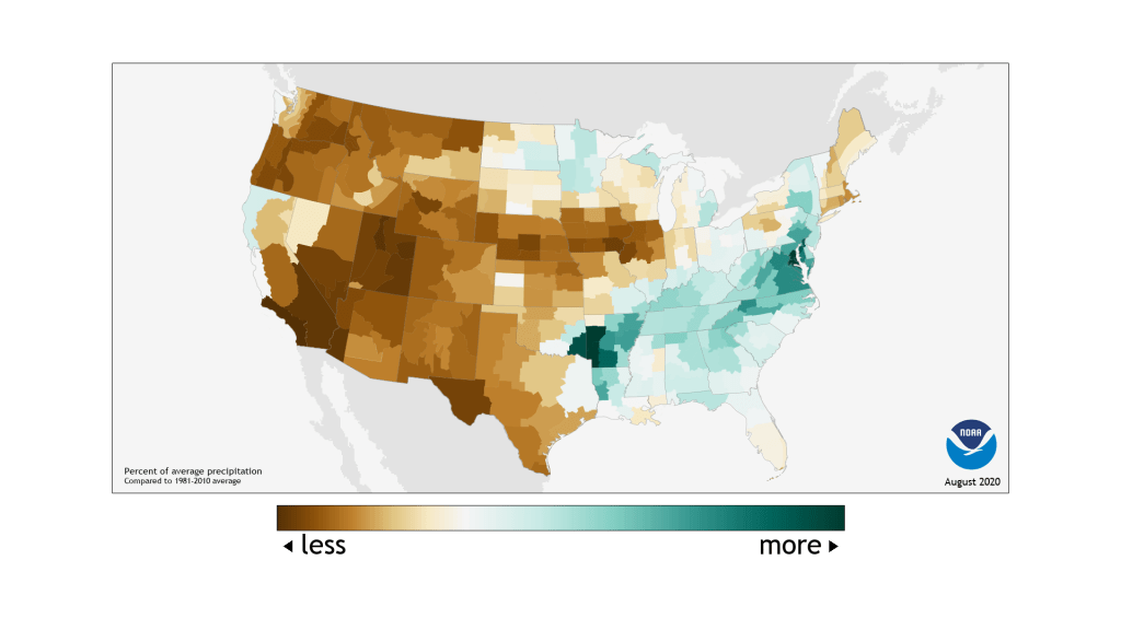 今年8月的美國西岸不僅溫度高於平均值,就連降雨量也是偏少,高溫且乾燥的氣候條件有利於森林火災的蔓延。