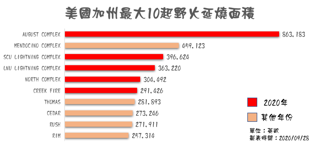 另外在官方的統計出規模最大的前10名發生在加州的野火事件中,第1名是2020年的8月綜合大火(AUGUST COMPLEX),超過86萬英畝的面積,同時也是當地有紀錄以來最嚴重的野火事件。第2名發生在2018年7月,面積只有46萬英畝。除此之外,前10名中還有4名都發生在2020年。