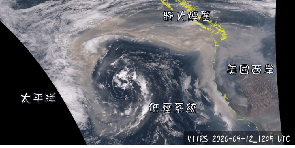到了9月12日,太平洋上空出現一個低壓系統,開始把周圍的煙塵捲入。在雲圖上也可以看到,由於風向出現的變化,使得西岸的煙塵開始往美國內陸擴散。