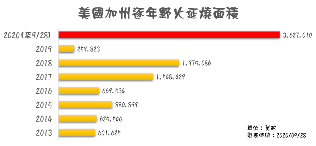 今年的加州野火嚴重程度與澳洲野火相比毫不遜色,根據加州林業與消防局網站(CAL Fire)的資料,截至2020年9月27日為止,全年加州已發生了接近8000場大大小小野火事件,同時也是1997年有紀錄以來,野火排碳量放最高的一年。