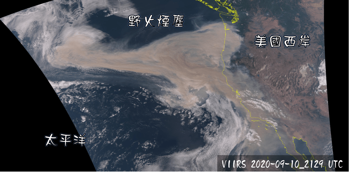 從2020年9月10日VIIRS真實色影像雲圖不難看見,加州森林大火所產生的煙塵,不論是規模與濃度都相當的嚇人,濃度高到足以完全遮蔽地貌。森林燃燒所產生的褐色濃煙不停地被釋放,大氣中將會充斥著大量懸浮微粒,當地的空氣品質絕對是急劇下降。