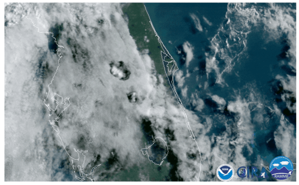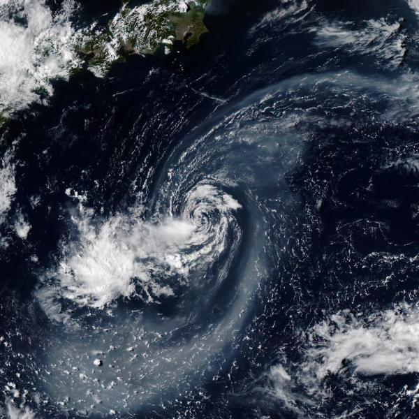 來自陸地的冷空氣是相對穩定的流體,其通過韓國濟州島這個「障礙物」時,便會在下風處產生卡門渦旋。